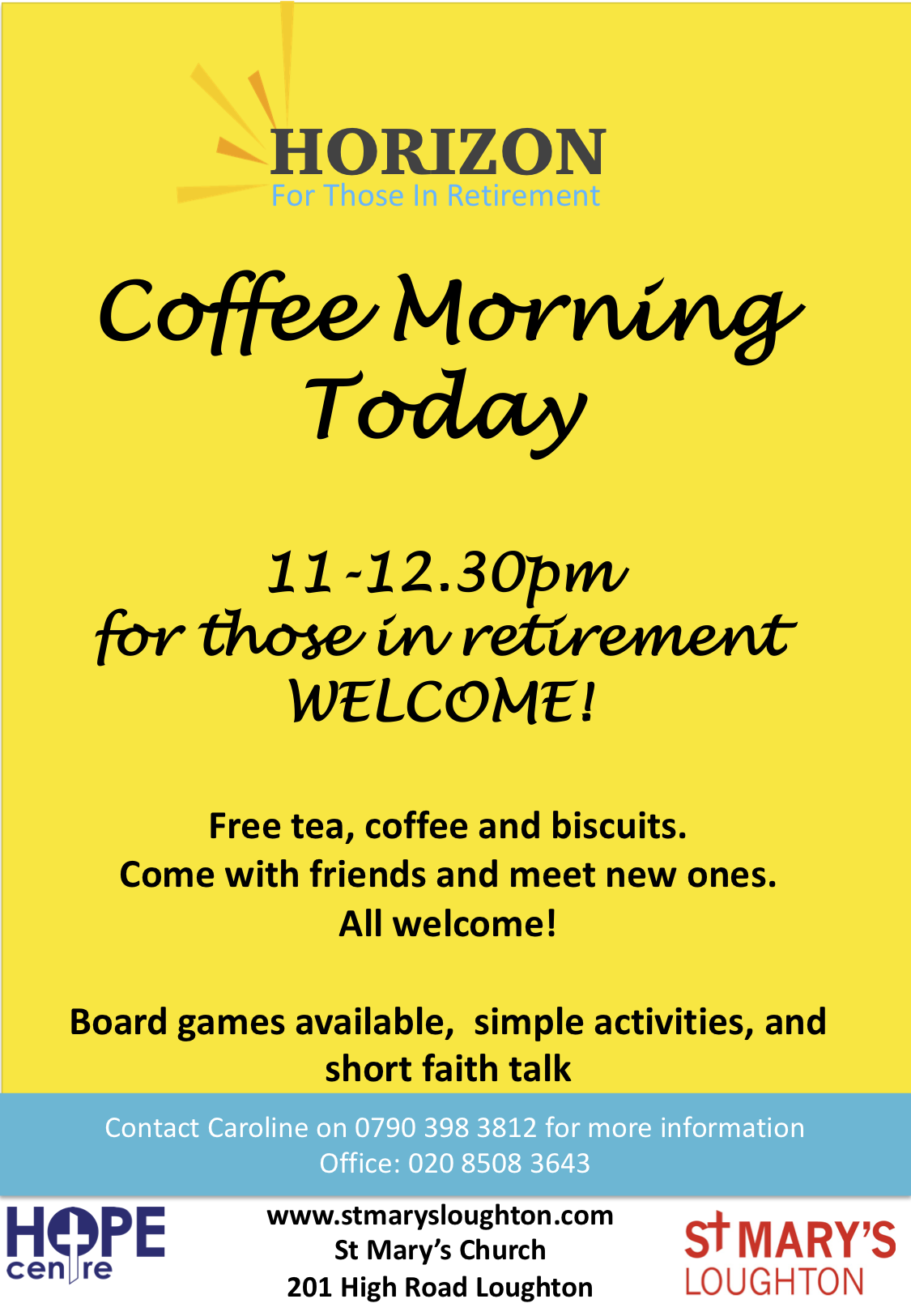 Every Friday during term time we have a Coffee Morning for those in retirement. It is a time of making friends, fun and laughter over a cuppa and a piece of cake. We have a simple activity and a short faith thought each week. Come along any time and we'd love to welcome you.